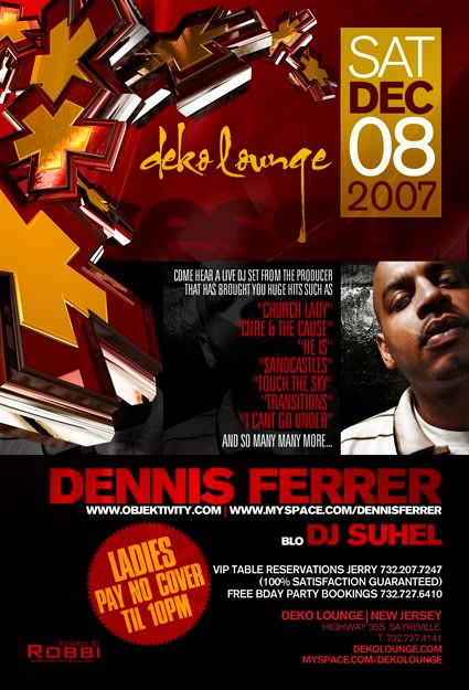 Saturday December 8thDeko Lounge Presents DENNIS FERRERhttp://www.objektivity.com | http://myspace.com/dennisferrer