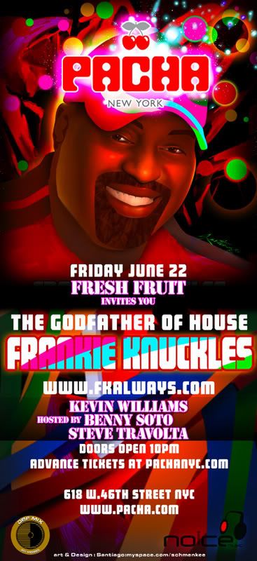 The FRESH FRUIT crew is pleased to invite you to Frankie Knuckles debut at Pacha. Fresh Fruit resident STEVE TRAVOLTA joins the Godfather of house FRANKIE KNUCKLES behind the decks for another night of fruit flavored fun!