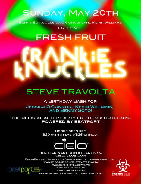 FRANKIE KNUCKLES & STEVE TRAVOLTA toss your fruit salad at gorgeous Cielo! They’re celebrating the birthdays of night birds-Jessica O’Connor, Kevin Williams, and Benny Soto! This is the official Remix Hotel-NYC after party powered by BEATPORT. Sounds like fruit salad to me!