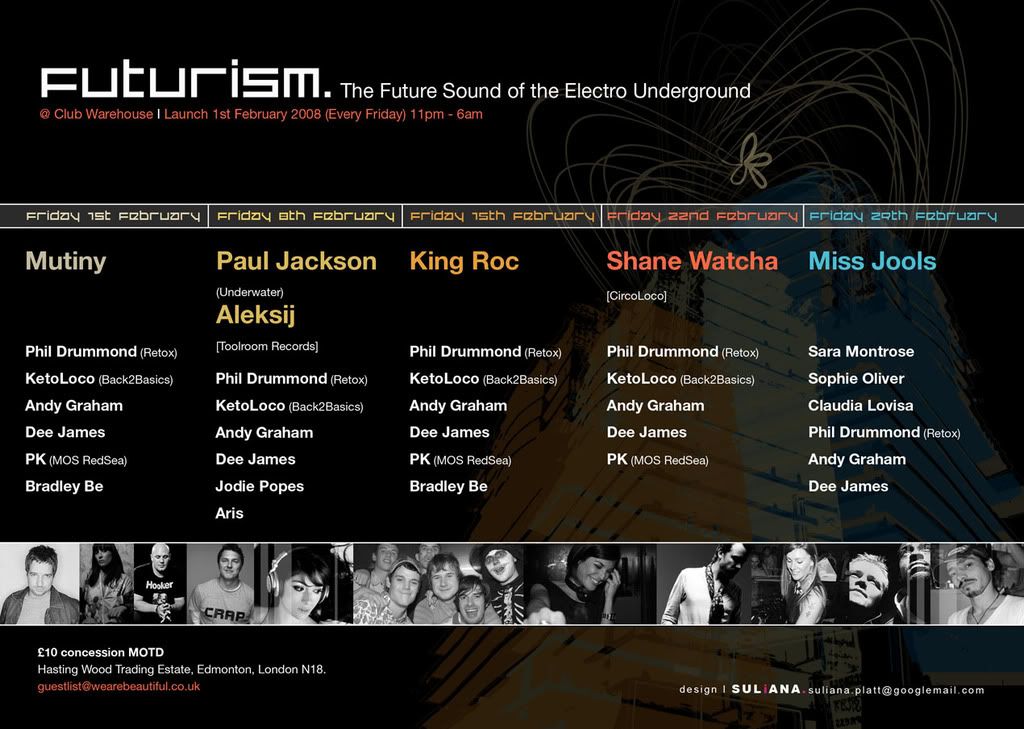 Ladies and gentleman, friends and fiends, welcome one and & all as we present to you the future sound of the global electro underground. A new year has arrived and a new vision begun, as the innovative new club concept Futurism launches its exclusive residency at Club Warehouse.