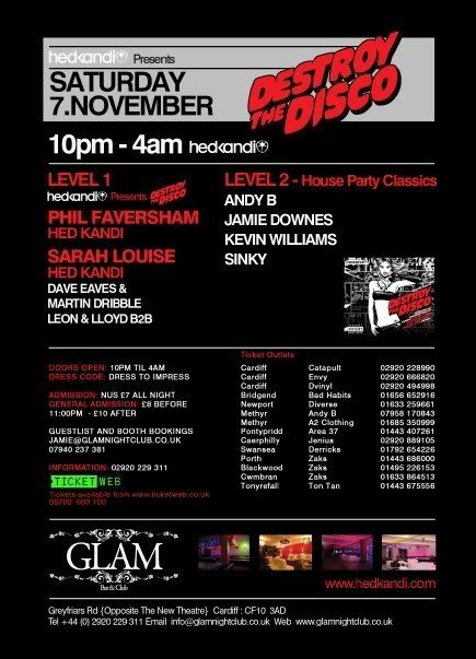 Hed Kandi presents Destroy The Disco! The deconstruction of disco has begun! Join us on Cardiff’s most salacious dancefloor! Our troupe of sensational DJs get set to tantalise you with bomb-blast basslines, cut-up disco and some filtered, filthy beats to keep you moving until the sun comes up! Main Room: Destroy The Disco! And 2nd Room Party Classics with Glam Hed Kandi Residents. See you on the 7th November @ Glam.