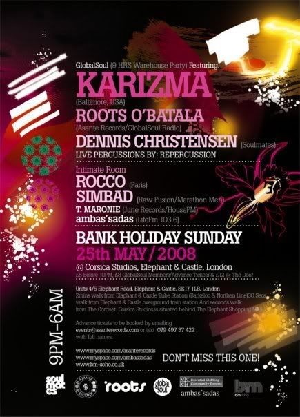 This Bank Holiday Sunday, May 25th, Asante Records kicks off its London GlobalSoul Parties at Corsica Studios.