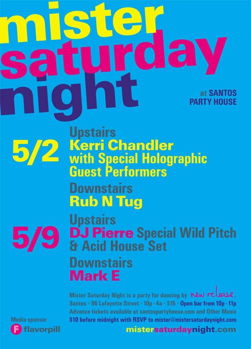 $10 with RSVP to mister@mistersaturdaynight.com Mister Saturday Night is a party for dancing by New Release. Flavorpill is his media partner.Since Mister Saturday Night came on the scene in January, he’s seen some amazing things happen.