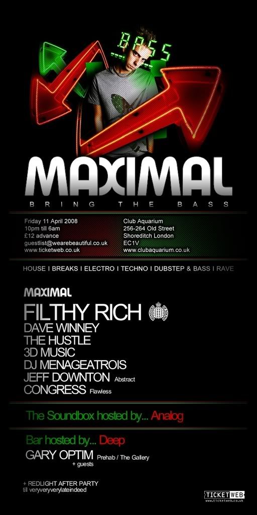 Booooooooooom! The Maximal crew are b b b b b back and this time we are on a mission my fiendish friends, to ‘Bring you the Bass’ as this month’s special edition is all about getting your BOOTY on that floor! Forget those mmnmnmnmnmnmnl bleeps, tweaks and technical techno beats this is the unashamed, untamed and undiluted sound of the ELECTRO underground and who best to ‘bring it’ than the man they call Filthy Rich! At only 24 the international DJ and Producer is at the top of his game; with residencies that include London’s Ministry of Sound, Kissdafunk and global cult sensation Hat Club alongside an ever growing fan-base watching every step, his reputation as one of the brightest stars is gathering steam at a furious pace. Joining the man in question we have Pacha’s Loose Control resident Dave Winney and guests 3D Music, and DJ Menagatrois in the main room plus many more…