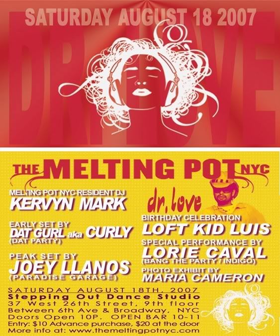 The DJ and talent lineup was carefully selected to ensure an all out dance party reminiscent of the early scene of the Loft and the Paradise Garage and representative of the underground as it is today. The venue will be the beautiful loft-style Stepping Out Dance Studios (37 West 26th St, 9th Floor, between 6th and Broadway). On the decks; DJ Dat Gurl aka Curly (Dat Party), Joey Llanos (Paradise Garage) and our Resident DJ Kervyn Mark. There will be a special live performance by Lorie Caval (Bang the Party; Indigo) and a special photo exhibit by Maria Cameron. The vibe begins at 10pm and there will be an open bar from 10pm-11pm for the early birds. Tickets will be sold in advance for $10 and at the door for $20. For now purchase your advanced tickets from a Melting Pot member at any of our recommended events below or from Dance Tracks (91 E 3rd St, New York, NY 10003, (t) 212-260-8729) and receive a free promotional CD while supplies last. You will be able to buy tickets online via PayPal early next week. Contact us at [email]info@themeltingpotnyc.com[/email] for more information, birthdays and special requests.