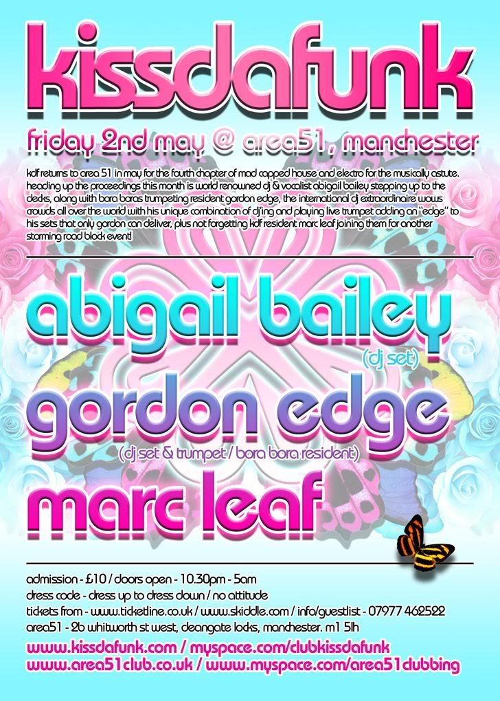 KDF returns to Area51 in for the 4th chpater of mad capped house and electro for the musically astute. Heading up the proceedings this month i world renowned DJ & Vocalist Abigail Bailey steppin up to the decks along with the Bora Bora trumpeting Gordon Edge.
