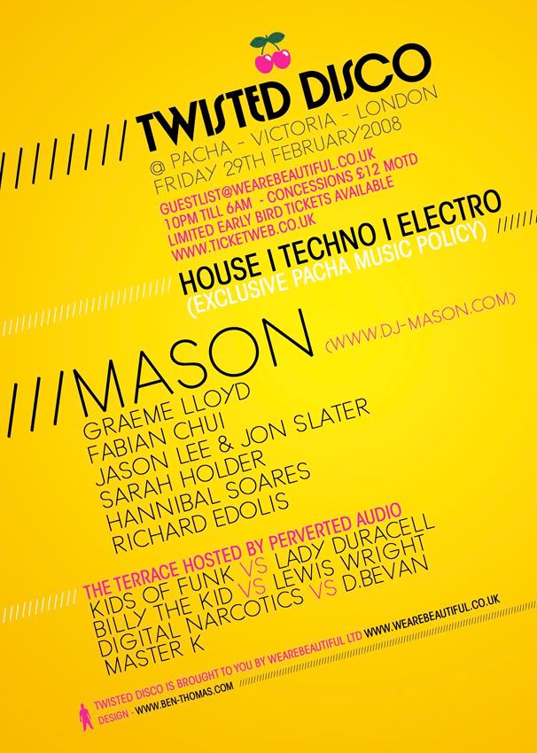 After mastering stadium gigs alongside Tiesto and headline appearances at dance music Mecca Festival Dance Valley in front of ten’s of thousands, Mason is primed and ready to unleash his arsenal of exclusive productions for your aural pleasure! This will be a night to be remembered so make sure you book your front row seat to the hottest ticket in town! Joining Mason on the night we have Twisted Disco residents Graeme Lloyd, Fabian Chui plus Jimmy Lee and Jon Slater who will be pushing the dirtiest underground hits from across the globe!