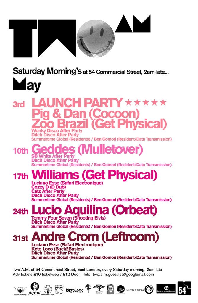 Over the course of the first 2 months of Two AM, you’ll be treated to guests from some of the coolest labels in the world: Cocoon Records (the awesome Pig & Dan and Lucio Aquilina bringing their groovy, hypnotic trance-infused version of minimal techno), Get Physical (Williams and Zoo Brazil bridging the gaps between electro and minimal) and Leftroom (Andre Crom, also of VeryVeryWrongIndeed). They will be supported by a host of London’s tastiest talent, from We Love…Ibiza resident Luciano Esse to the KetoLoco DJs, to resident DJs from Summertime Global, Ditch Disco, and Data Transmission’s Ben Gomori.